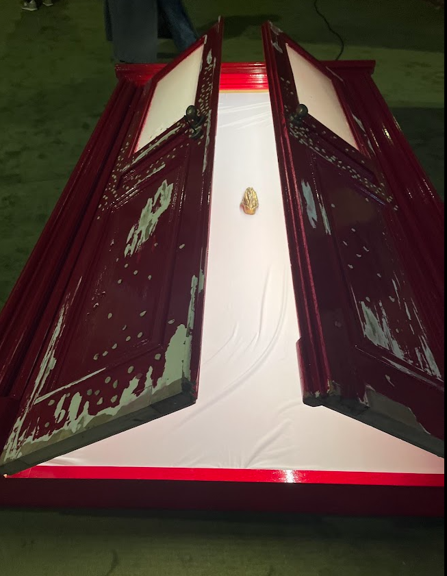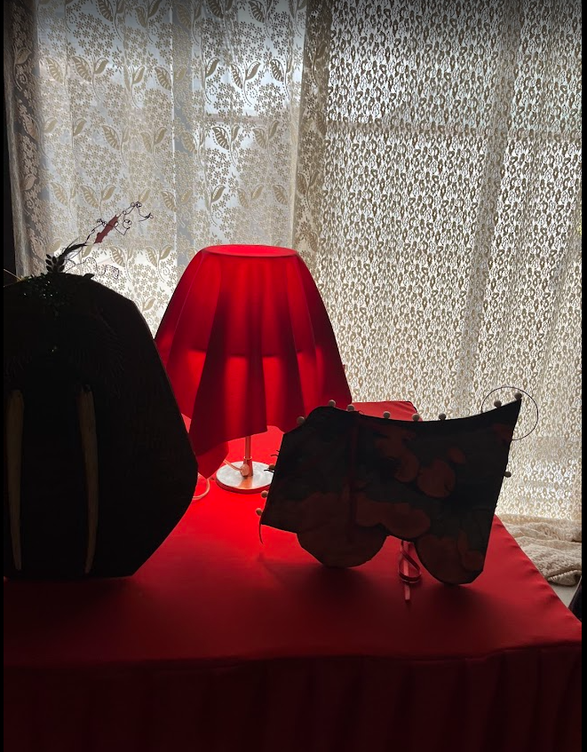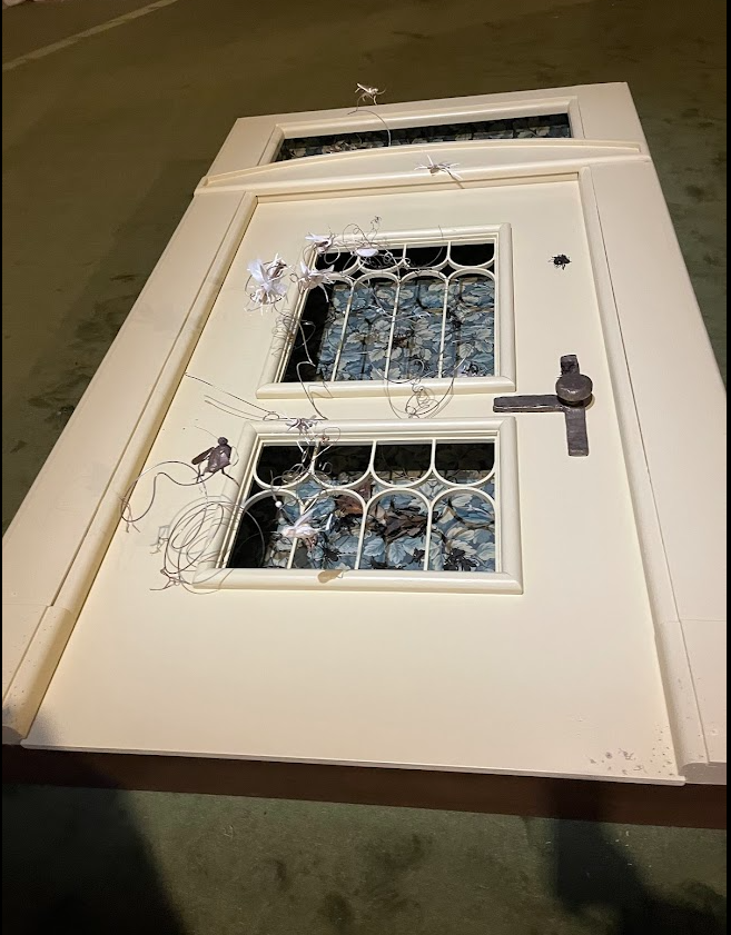 Nell’ambiente centrale, denominato Pancia, come l’organo che accoglie e metabolizza, cavità di metamorfosi e trasformazione legata a funzioni vitali primarie, si aprono o restano chiuse, una serie di porte che contengono una serie di altri ambienti narrativi. Le 9 porte «ripiene» non verticalizzano la Pancia, ma sono orizzontali, sono sdraiate a terra. Perché non hanno funzione di soglia, né di passaggio, bensì di botola aperte nel pavimento con all’interno stratificazioni narrative, soprattutto di film horror. C’è la Porta sussurri che bisbiglia tra gli insetti-sculture allusivi le parole degli angeli legate con fili dorati nell’Annunciazione di Beato Angelico, ma l’insetto è il protagonista la presenza scomoda ripugnante.