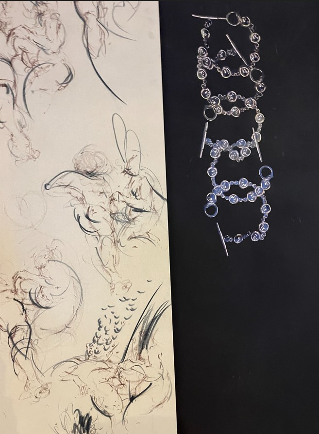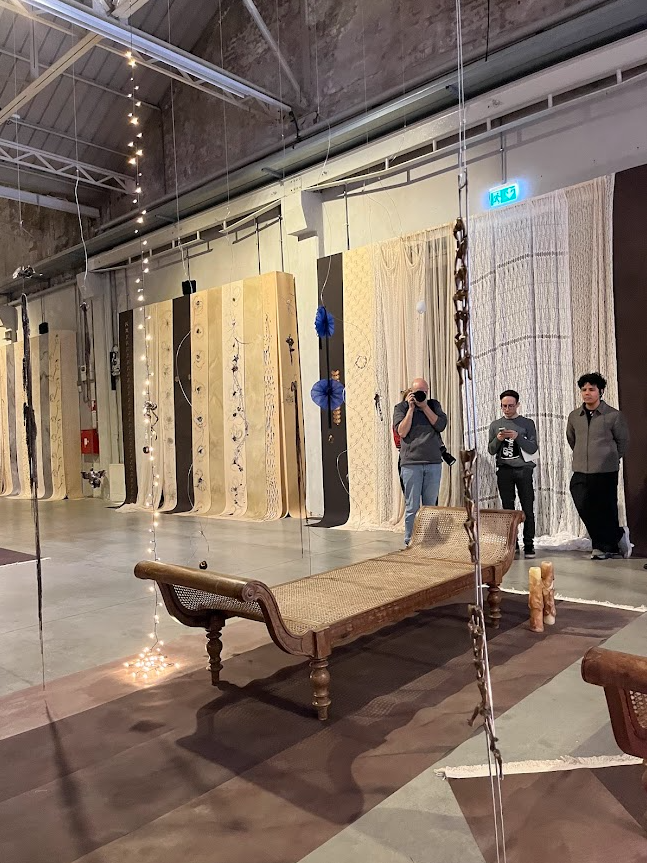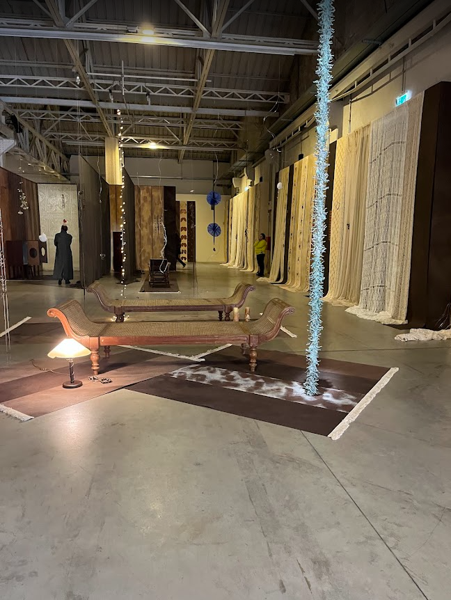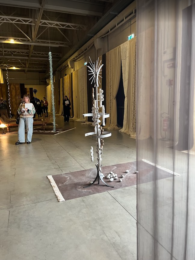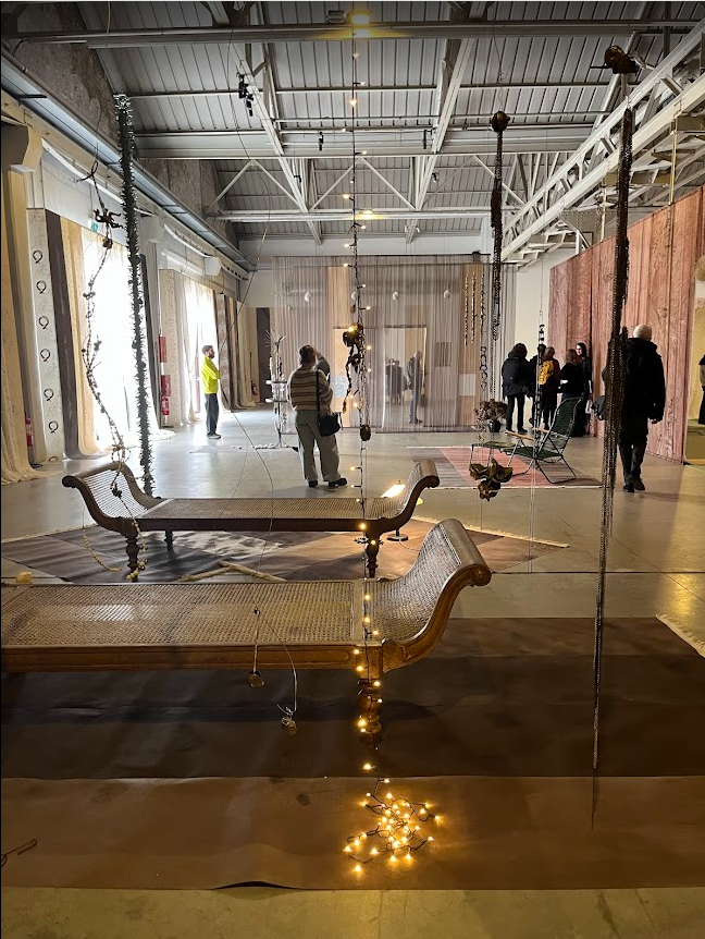 Benni si declina come scultrice-orafa nelle stalattiti/stalagmiti che pendono dal soffitto in un brulichio di baci, capezzoli e altre parti anatomiche che ora si calano dal soffitto ora si arrampicano verso l’alto, decorando lo spazio tutto da vivere: sulla destra, nella Guancia – dove riaffiorano ricordi di infanzia e desideri istintivi e corporei – ci sono postazioni per sedersi o chaise longue – sottratte alla Madame Récamier di Jacques-Louis David – su cui stendersi e in cui è possibile sostare, tappeti dalle trame preziose calpestabili.