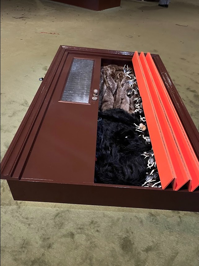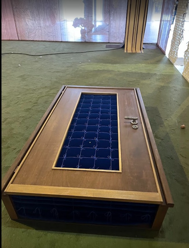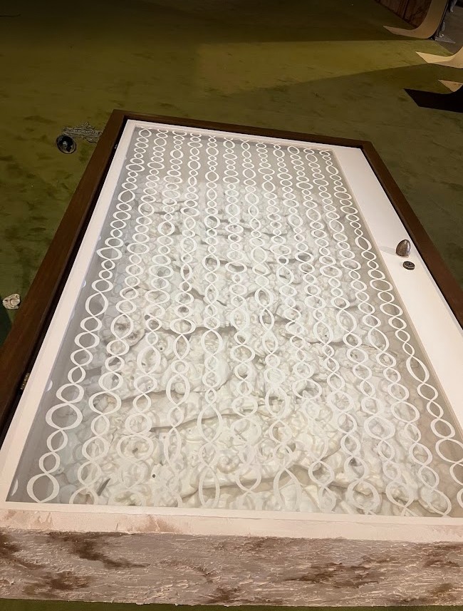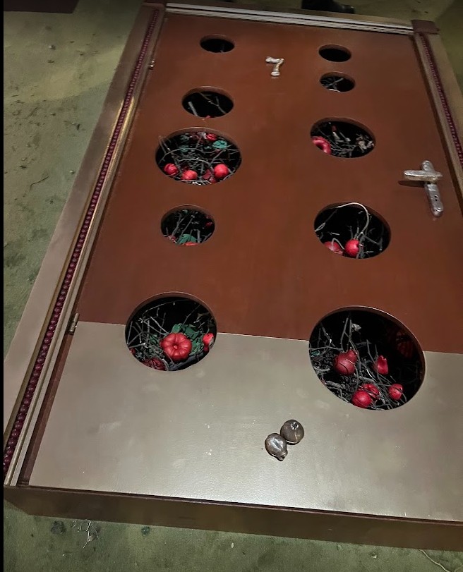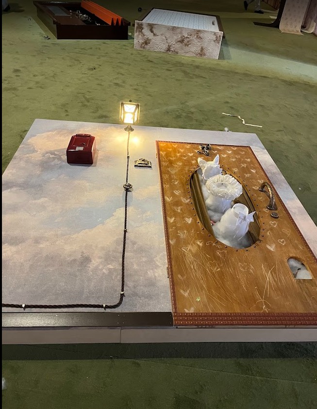 Anche le porte apparentemente vuote perché chiuse non ci mostrano cosa contengano, invece stratificano le storie personali anche dell’artidta bambine, come la Porta Pisello, allusiva la fiaba La Principessa sul pisello di Andersen, secondo una prospettiva ribaltata, perché non c’è la principessa e non sappiamo nemmeno se sotto il materasso ci sia il pisello, ma rimanda a un ricordo d’infanzia dell’artista: i baccelli di piselli sgranati per la zuppa insieme ai familiari un gesto lento e condiviso. Il velluto blu che imbottisce l’anta chiusa, oltre a rimandare al materasso della fiaba, è un omaggio all’opera Holderine object di Joseph Cornell, una scatola il cui contenuto è velato da un involucro di velluto ceruleo.