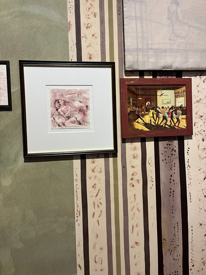 Dipinge pure i copricapo dei tangheri che ballano nel lato sinistro dell’aviorimessa e rappresentano teste di altre specie viventi per parlare d’amore con comicità.