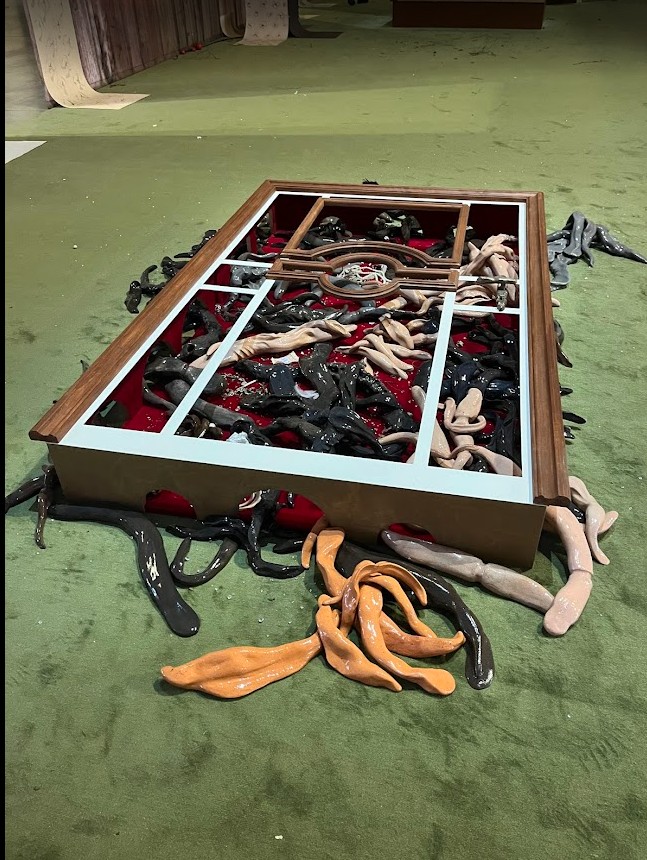 Ancora più orrorifica è la Porta della spogliarellista, in cui creature dall’aspetto viscido realizzate in ceramica si annodano una sopra all’altra. Un’altra porta si trasforma in un armadio di pellicce, al cui interno gusci di cozze e altri crostacei vengono antropomorfizzati tramite l’aggiunta di piccole gambe. Non mancano riferimenti alla letteratura antica, come la Porta degli Imbambolati dedicata alle Nuvole di Aristofane.